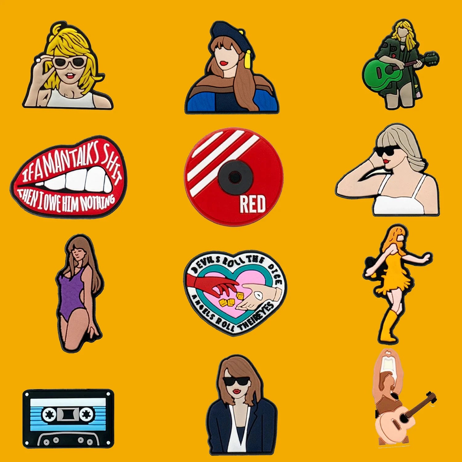 12/36pcs Taylor Swift-inspired shoe charms featuring eras outfits, lyrics, album covers, and pop star icons for Crocs and clogs