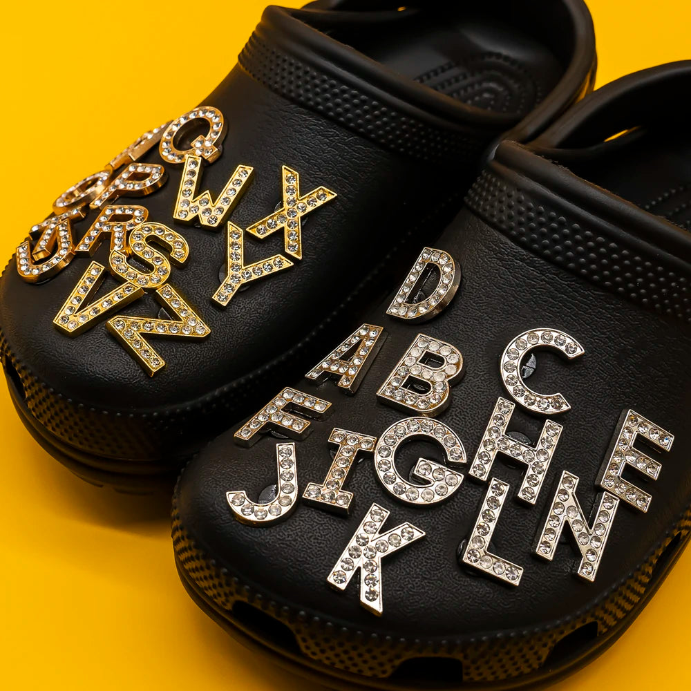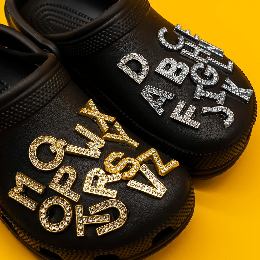 Black clogs with rhinestone letters shoe charms on a yellow background