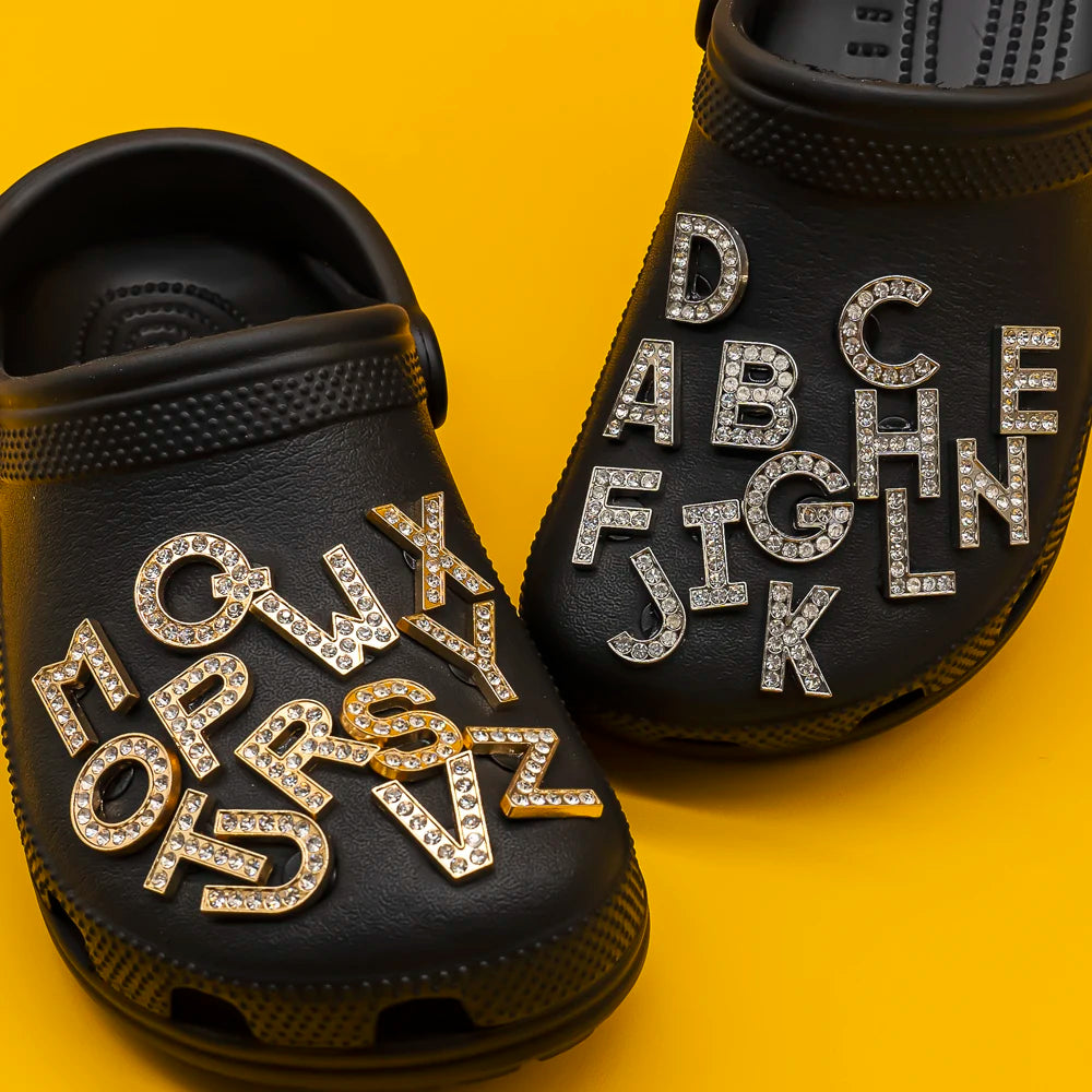๐Ÿ”  Rhinestone Alphabet Shoe Charms (26pc) โ€” Gold & Silver Aโ€“Z