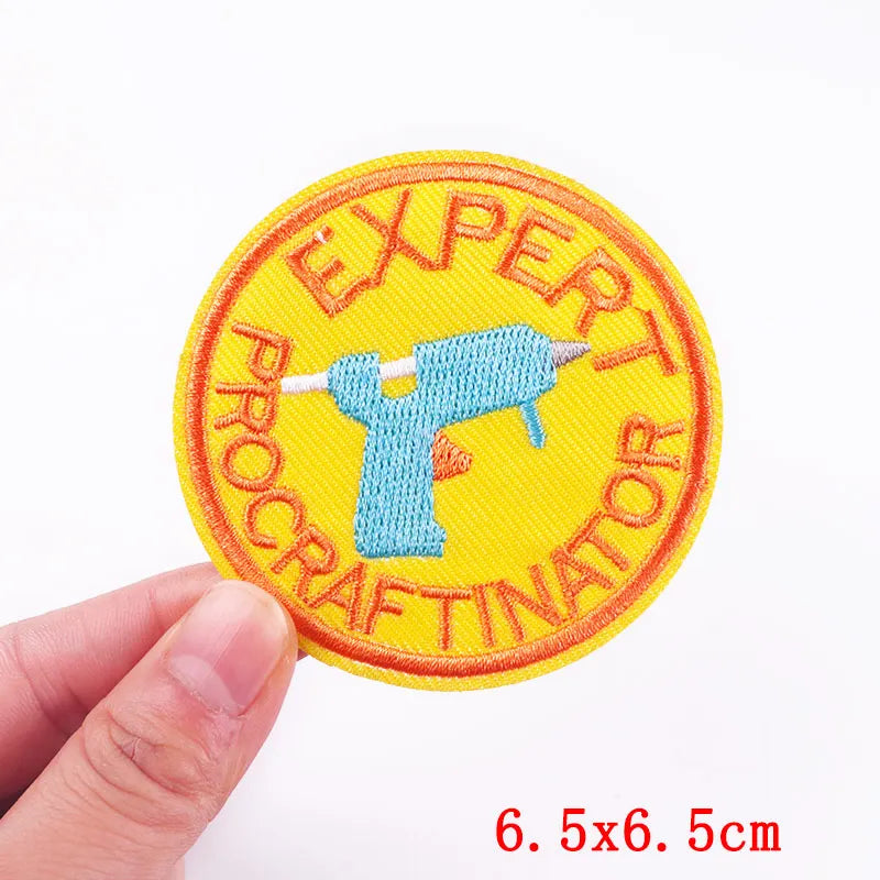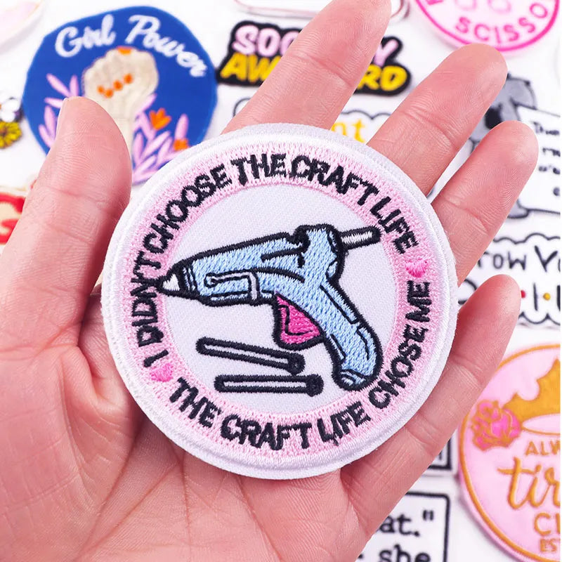 Patch with text and a hot glue gun illustration held in a hand, surrounded by other patches.
