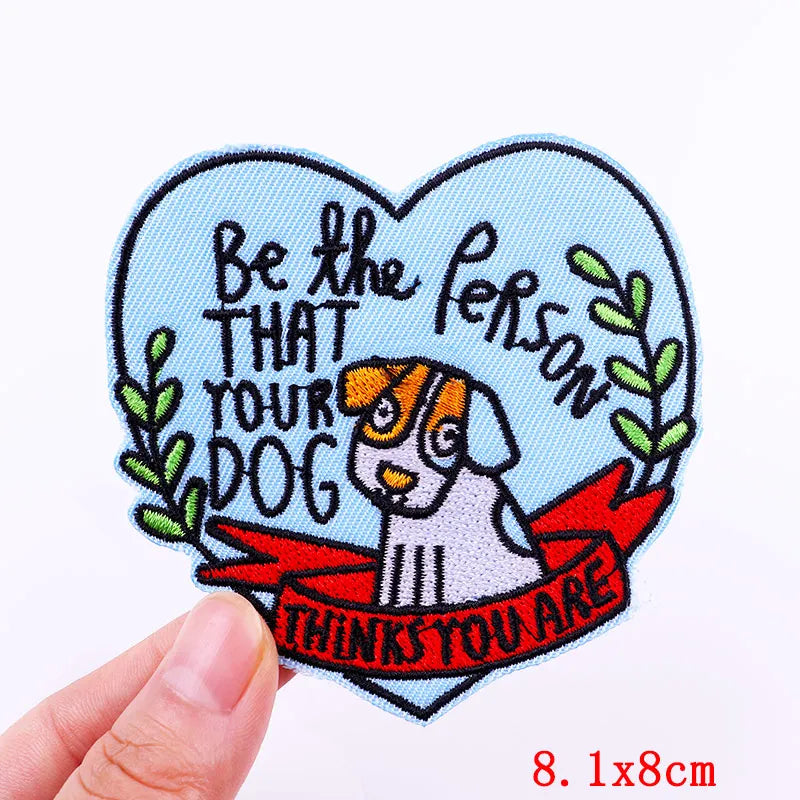 Heart-shaped patch with a dog illustration and text held by a hand on a white background