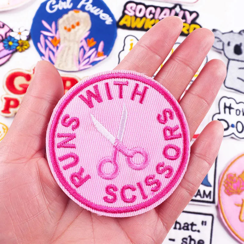 Pink patch with scissors and text held in a hand, surrounded by other patches.