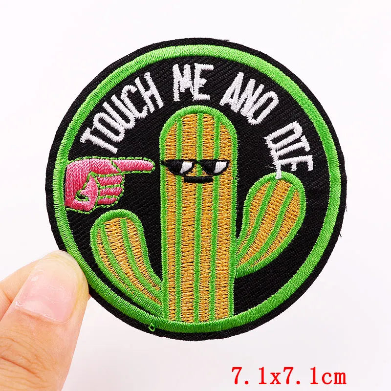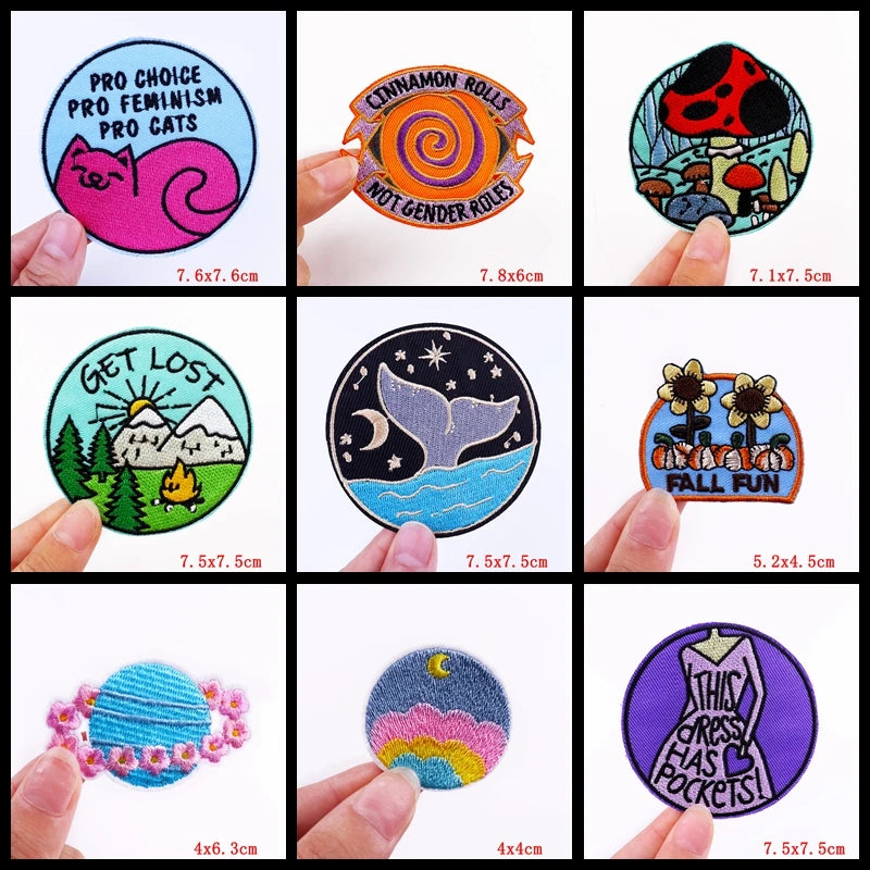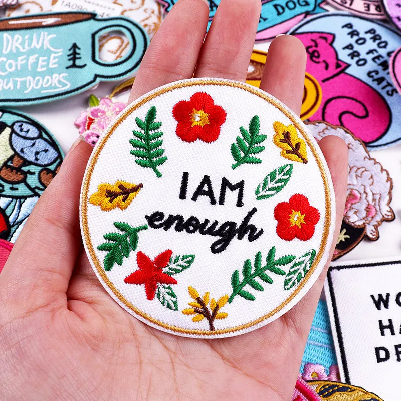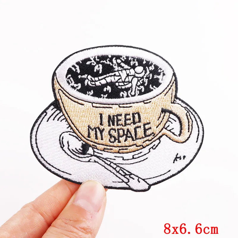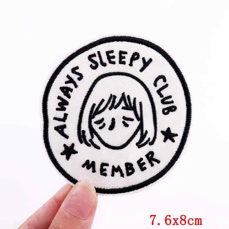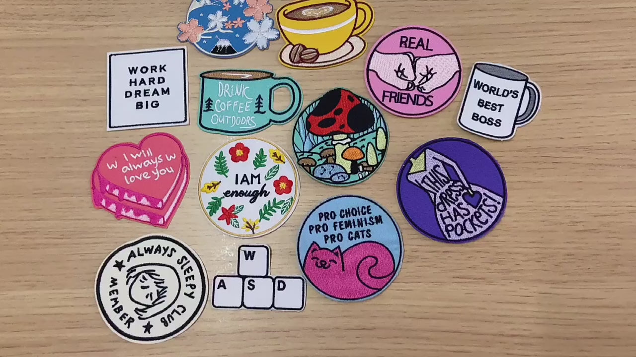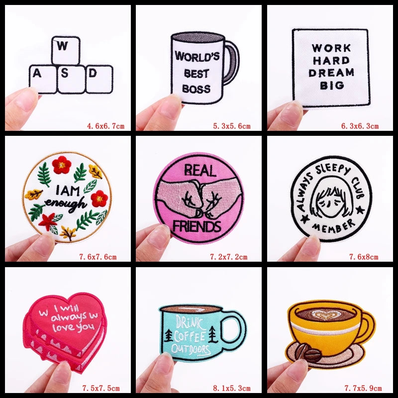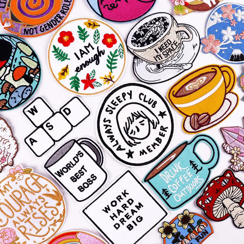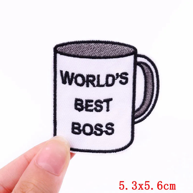Iron-on embroidered patches with coffee cups, quotes like “World’s Best Boss,” and cozy sleepy club designs