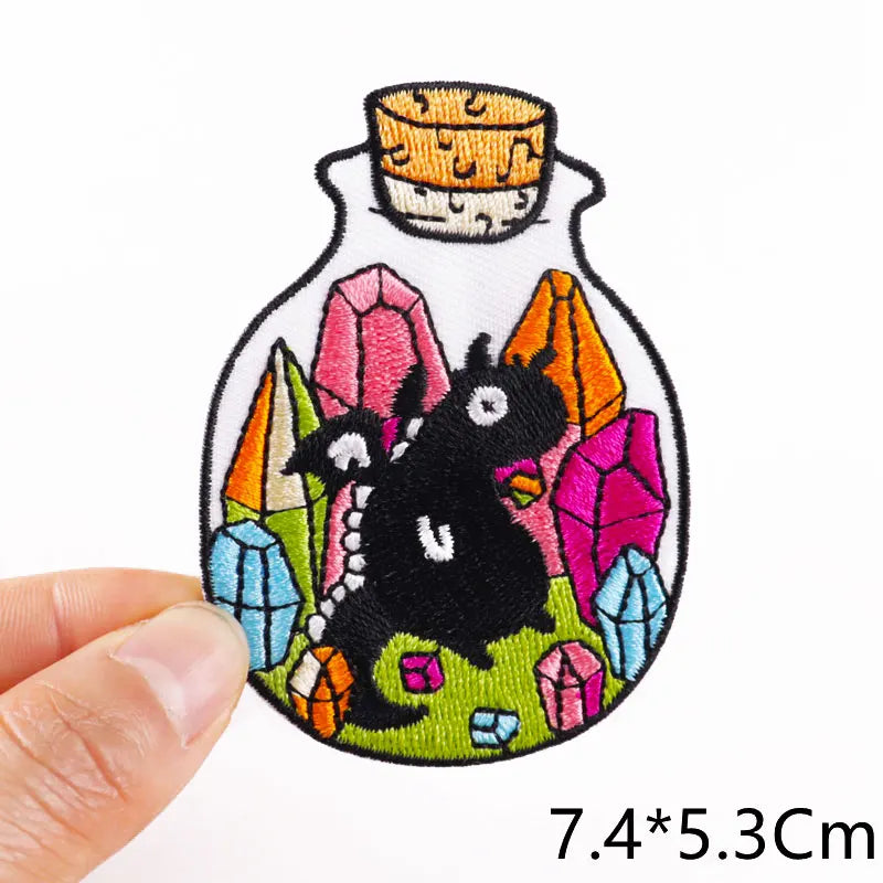 Embroidered patch of a black cat in a bottle with colorful crystals held by a hand.