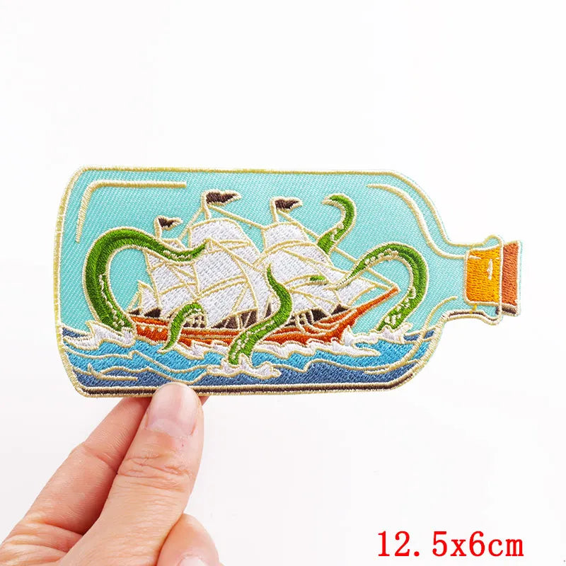 Embroidered patch of a ship in a bottle held by a hand on a white background