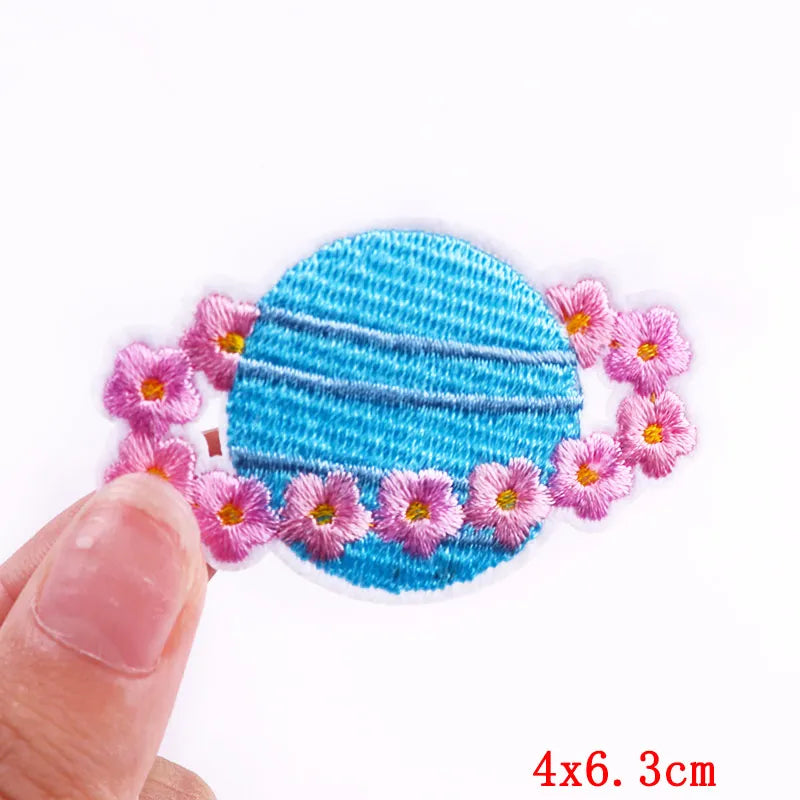 Colorful embroidered patch with a pink flower and purple crescent moon held by a hand on a white background.