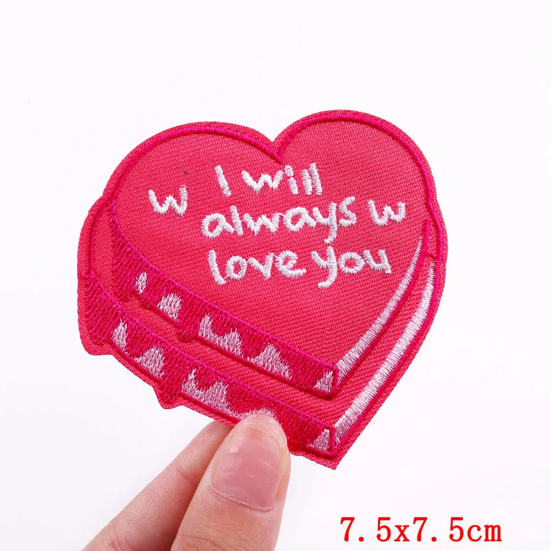 Heart-shaped patch with two hands holding a sword and shield, labeled &