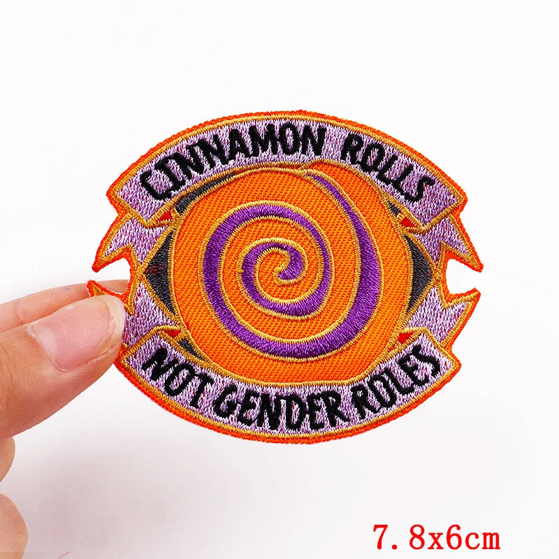 Patch with orange and purple spiral design and text held by a hand on a white background