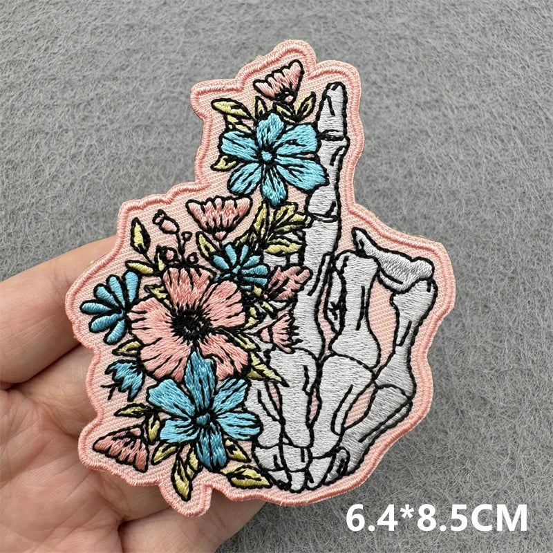 Decorative patch with floral and skeleton design held by a hand on a gray background