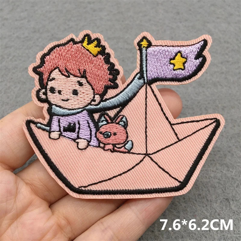 Embroidered patch of a character with pink hair and a small creature on a paper boat, held by a hand.