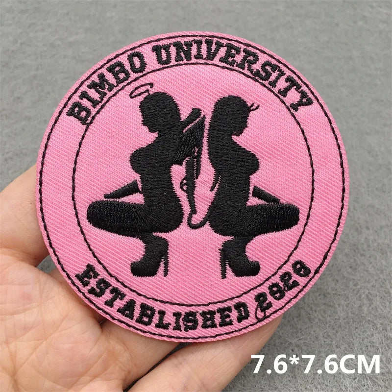 Pink patch with black silhouettes and text held by a hand on a gray background