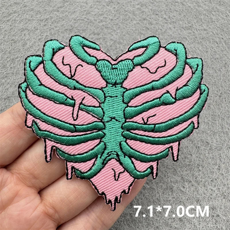 Pink and green skeleton ribcage patch held by a hand on a gray background