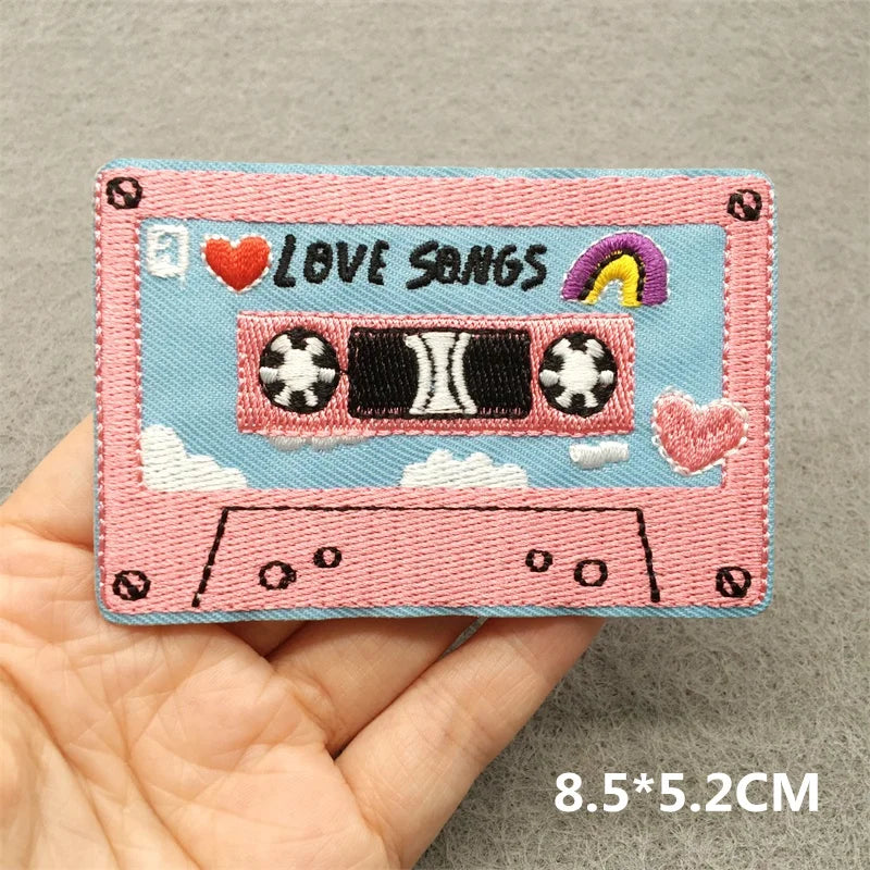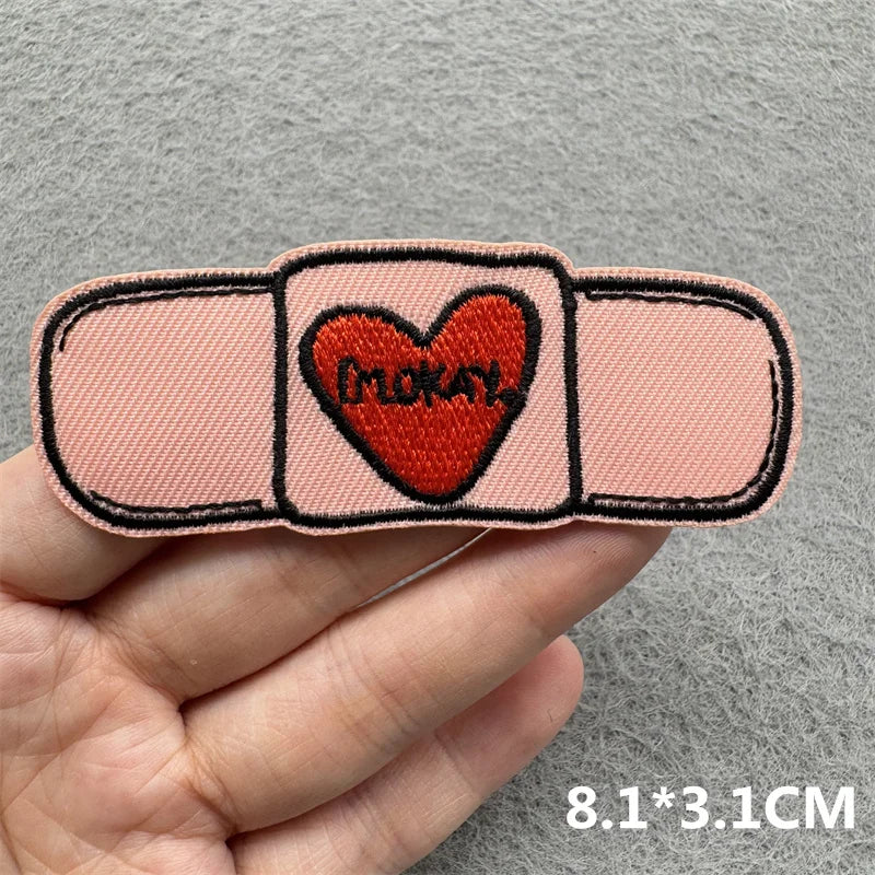 Heart-shaped patch with embroidered text and designs held by a hand on a gray background
