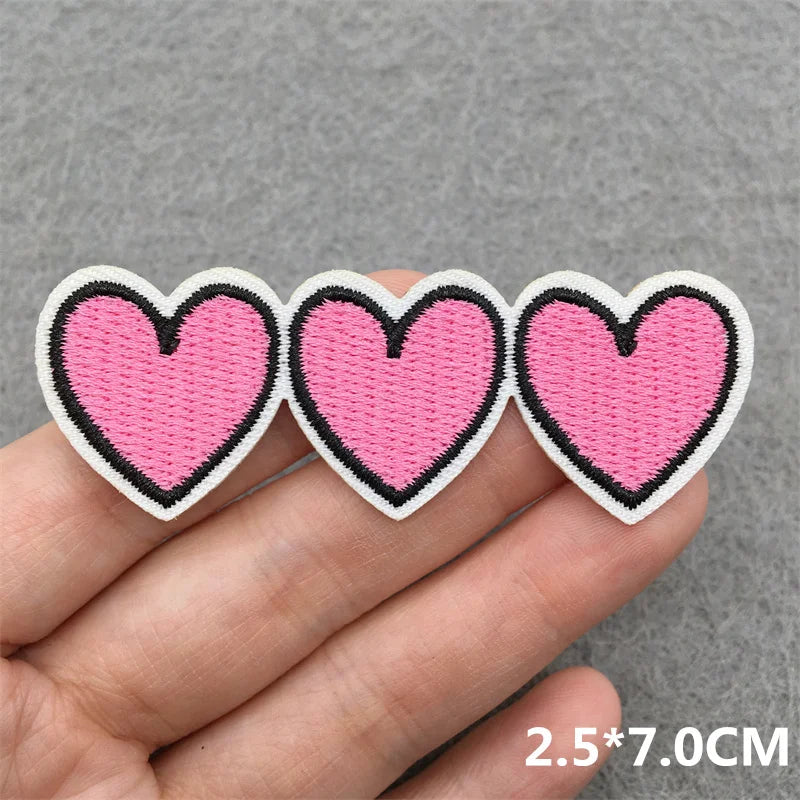 Pink heart-shaped patch with black text held in a hand on a gray background