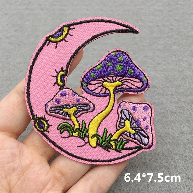 Pink embroidered patch with mushrooms and a moon held by a hand on a gray background