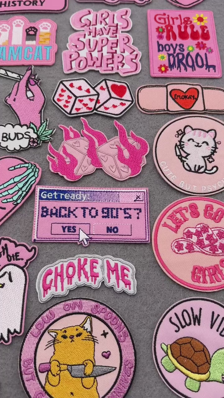 Give your outfit a rebellious twist with embroidered cartoon & quote patches. From spooky skulls to cheeky slogans, each design adds a bold voice to jackets, denim, vests, totes, and backpacks.