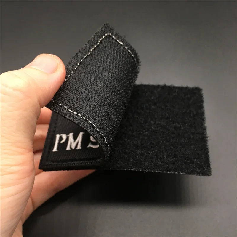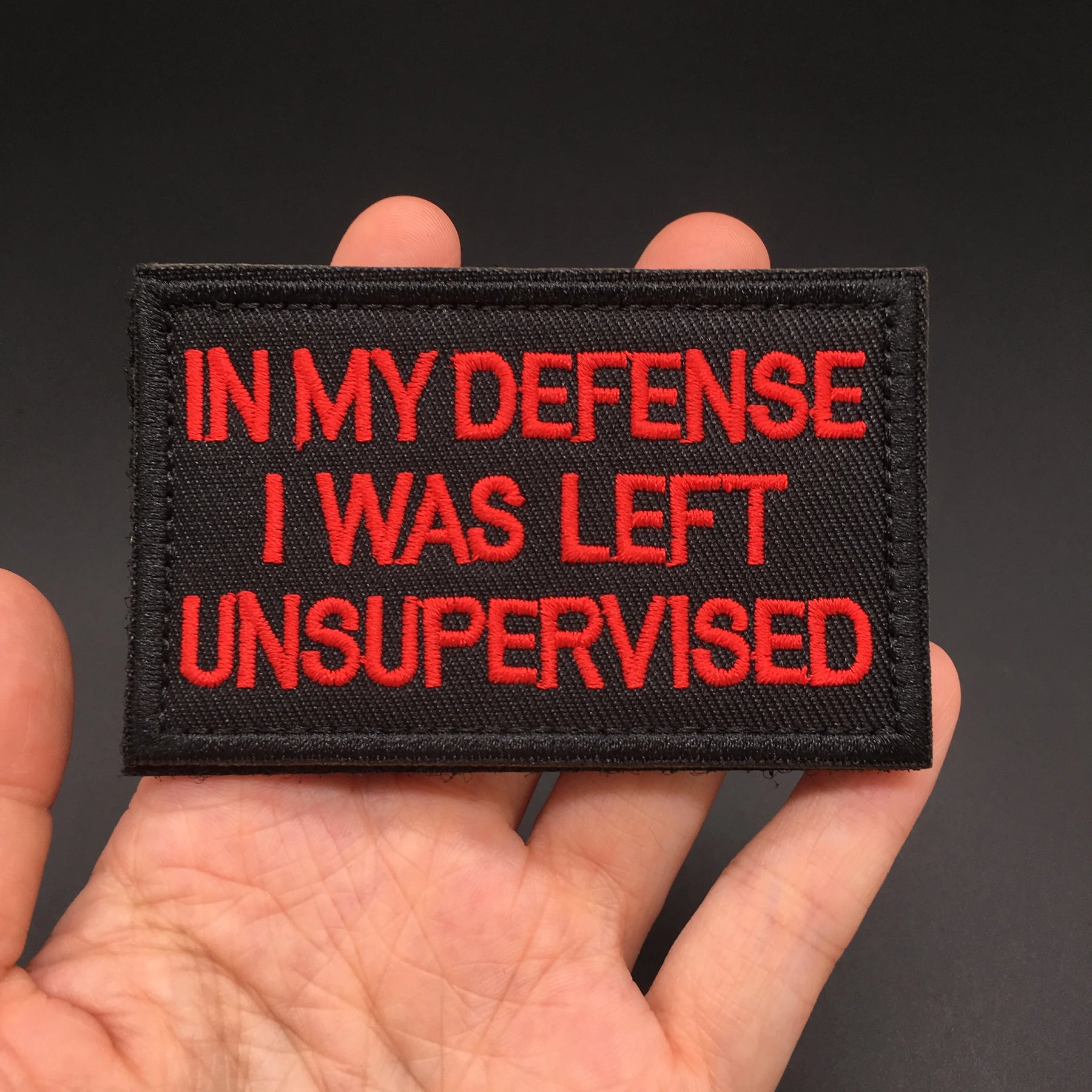 Black patch with white text held in a hand against a dark background