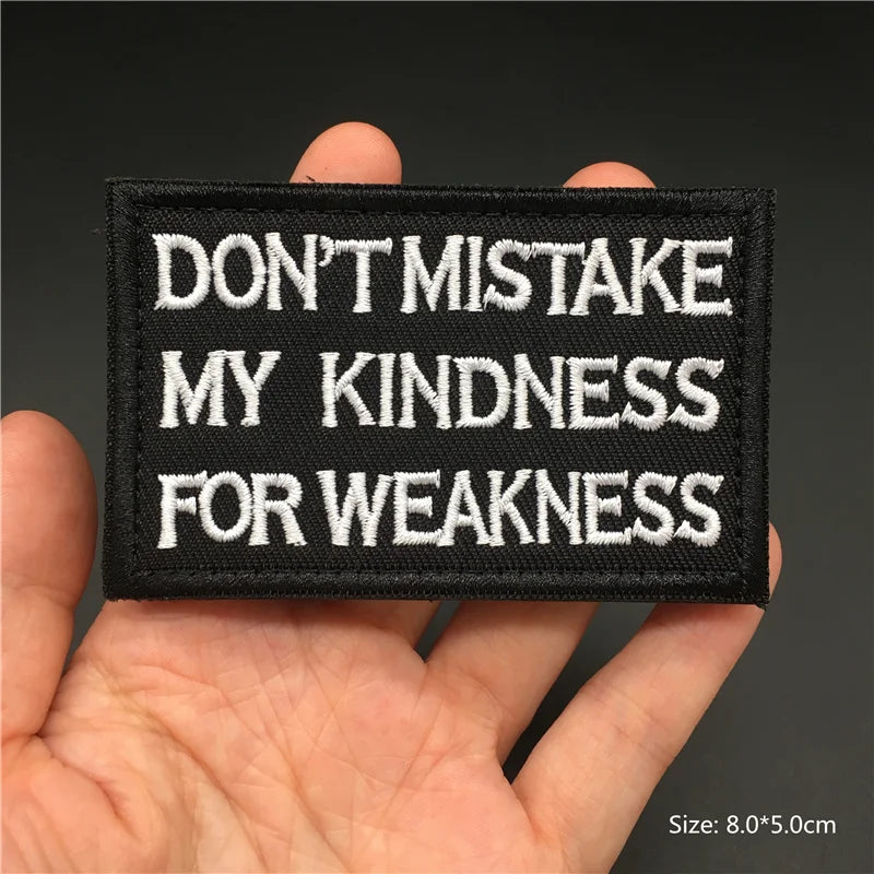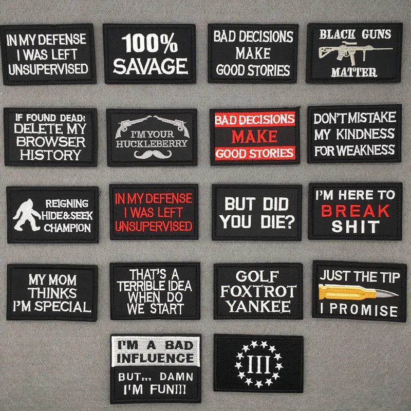 Add bold attitude to your gear with a single embroidered quote badge. Built with durable hook-and-loop backing (not iron-on), it snaps on and off tactical vests, bags, jackets and caps in seconds.