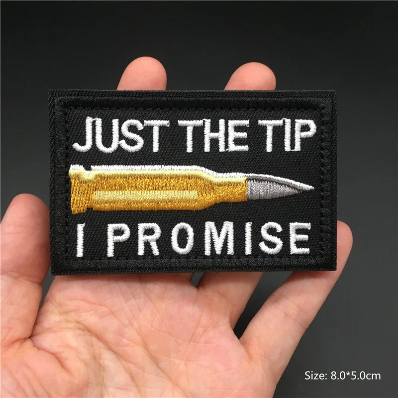 Embroidered patch with a bullet graphic and text held in a hand against a dark background