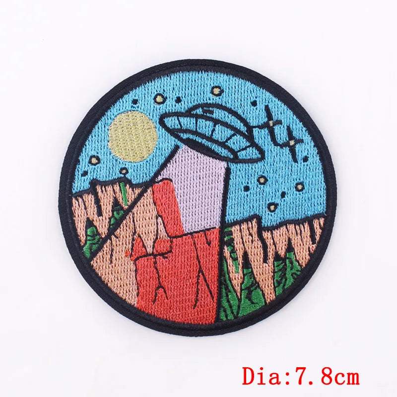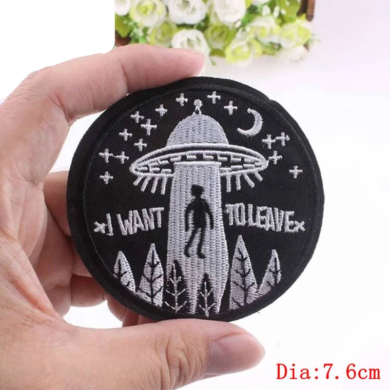 Embroidered patch with UFO design held by a hand, brand &