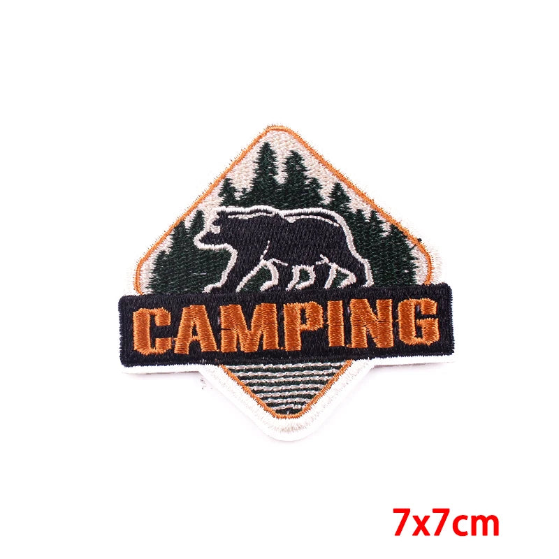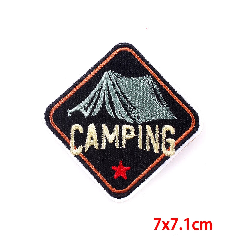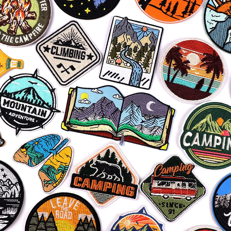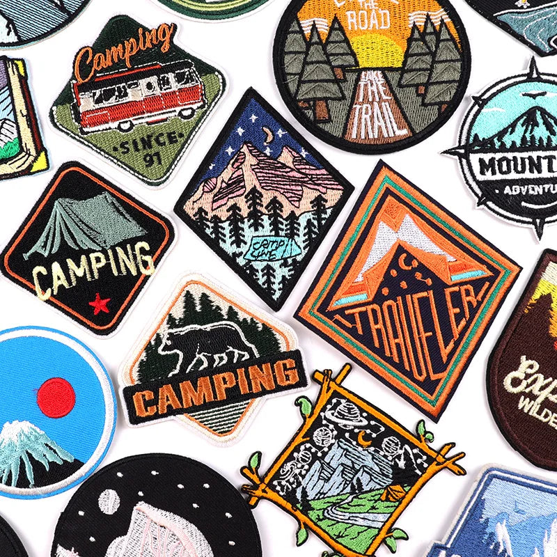 Mountain and camping iron-on embroidered patches with outdoor travel and landscape designs for jackets and backpacks