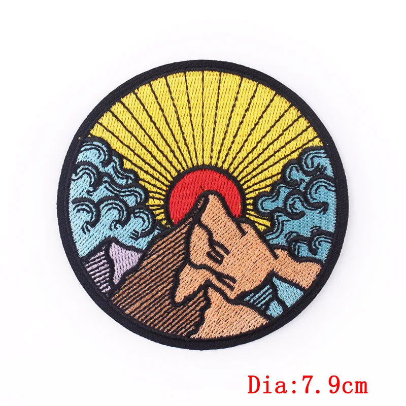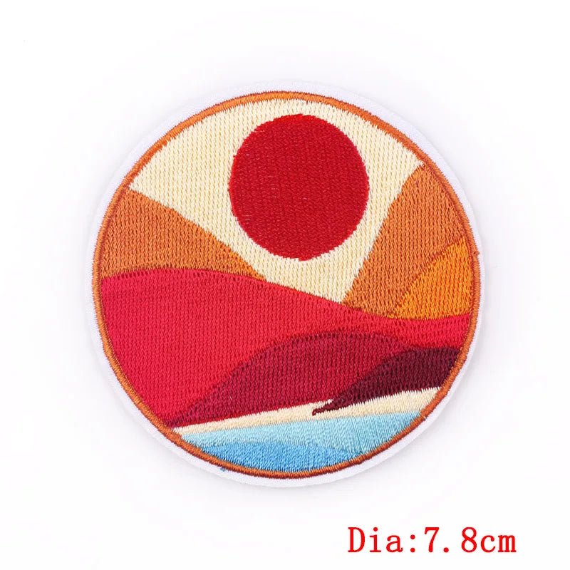Circular embroidered patch with mountain, sun, and wave design on a white background