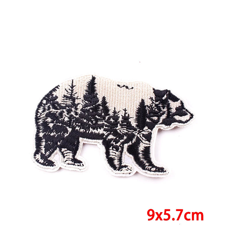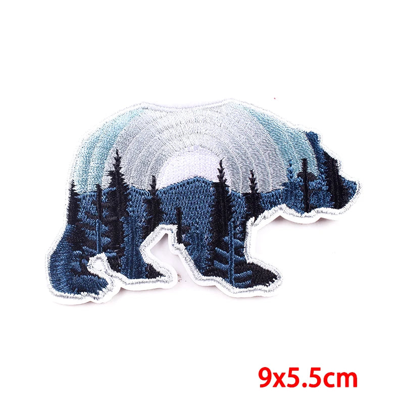 Embroidered bear patch with forest design on a white background