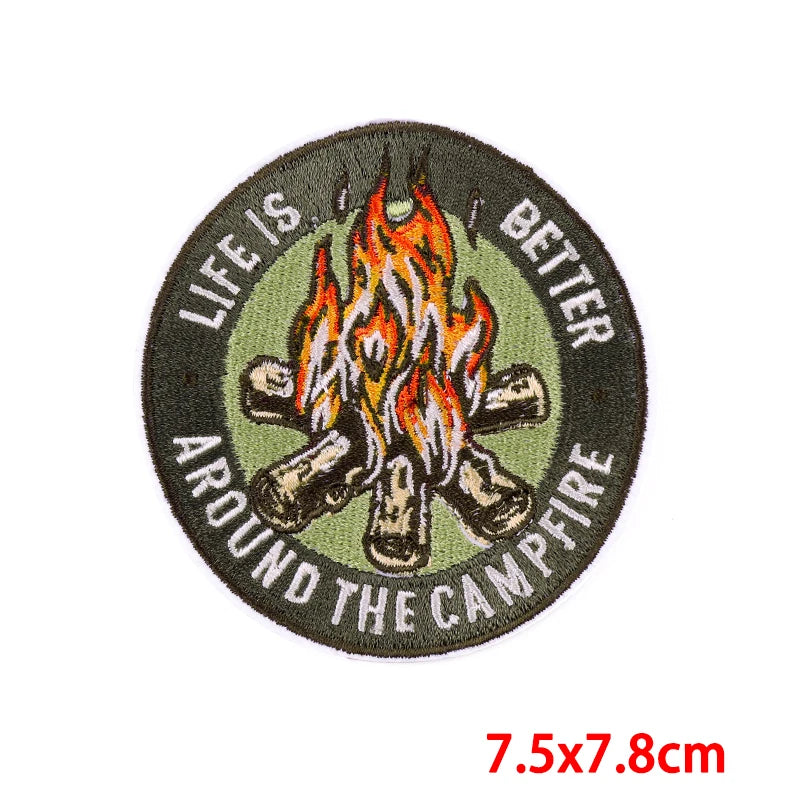 Round patch with campfire design and text &
