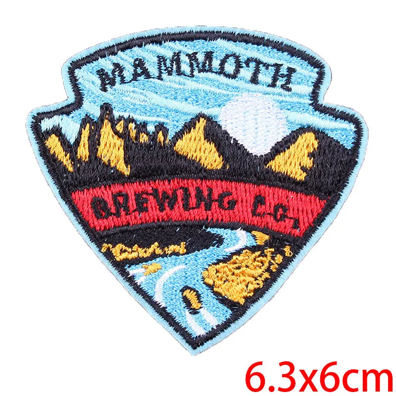 Mountain-themed patch with embroidered design on a beige background