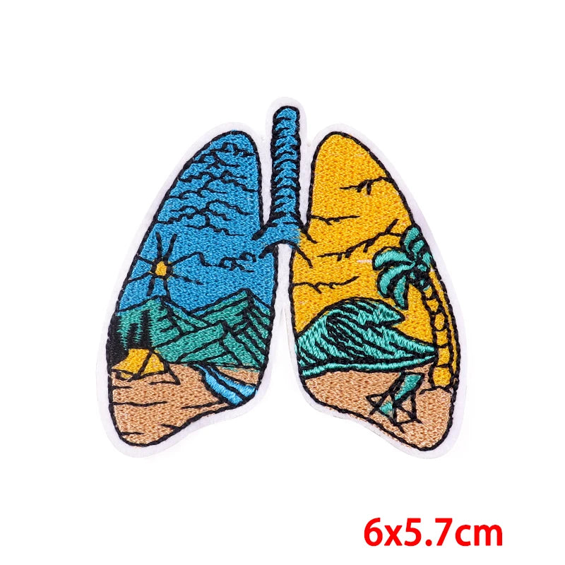 Colorful patch designed like lungs with a tropical scene, size 6x5.7cm.