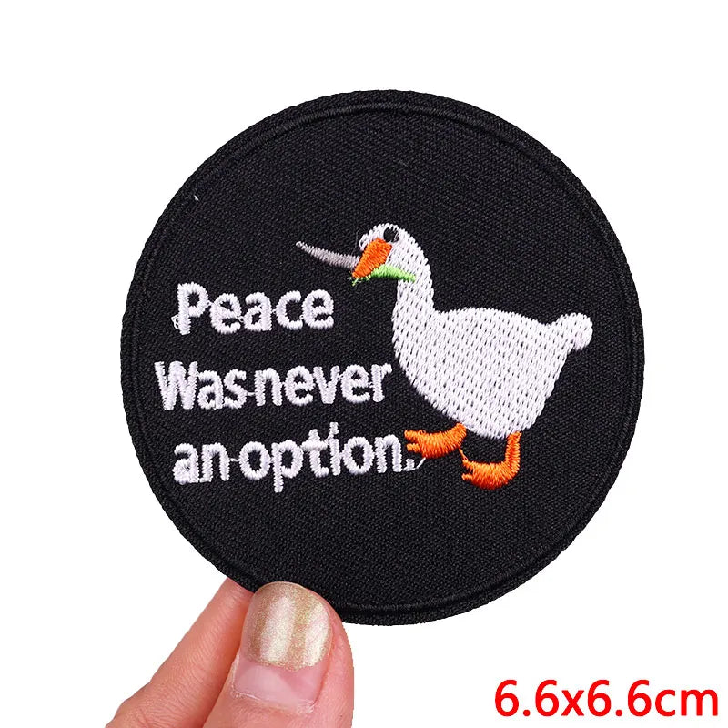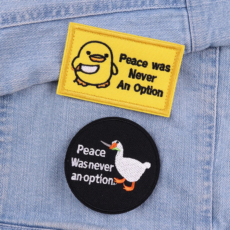 Two patches on a denim jacket: one with a duck and text, the other with a goose and text.
