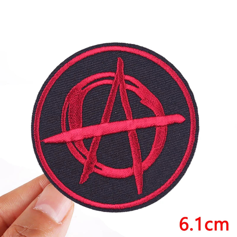 Red anarchy symbol patch on a black background held by a hand, with a measurement label &
