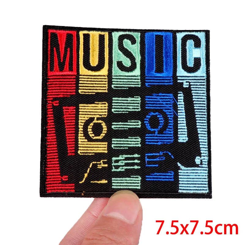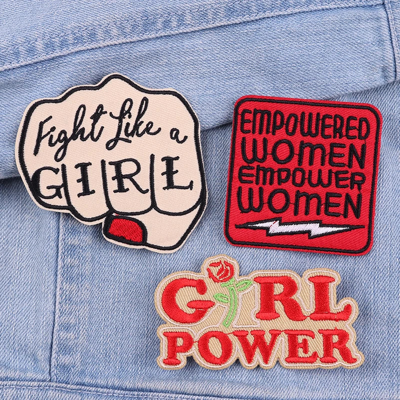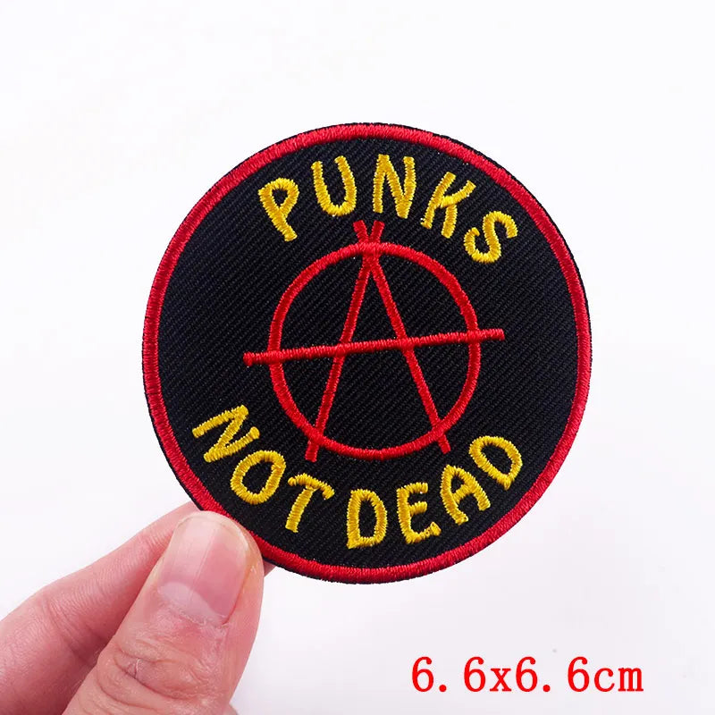 Colorful punk-style embroidered patches with slogans like "Punks Not Dead", "Girl Power", and "Don't Panic"Collection of various patches with different designs and text on a white backgroundCollection of colorful patches on a denim jacket