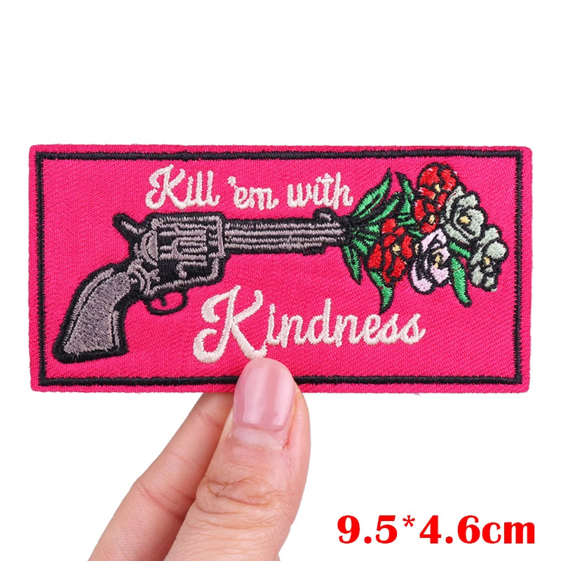 Pink patch with gun and flowers design held by a hand, on a white background.