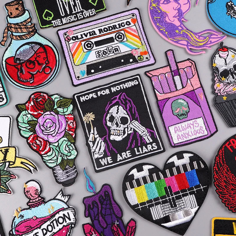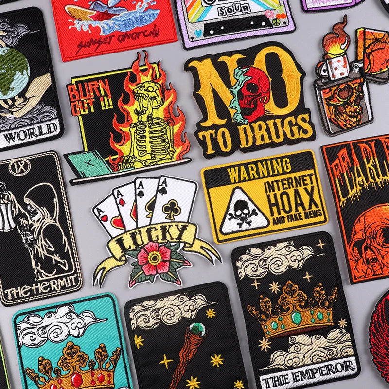 Channel dark, mystical energy with embroidered designs that fuse tarot iconography and punk attitude. Choose from flaming skulls, The Hermit, crowned skulls, “No to Drugs”, flaming laptops and more—built to turn jackets, bags and denim into a personal manifesto.