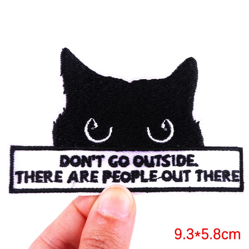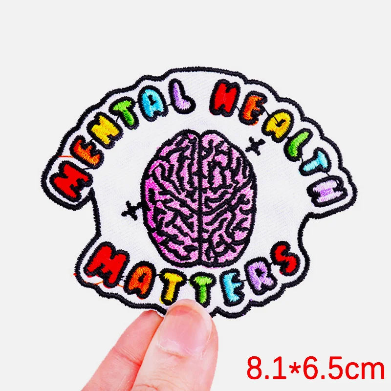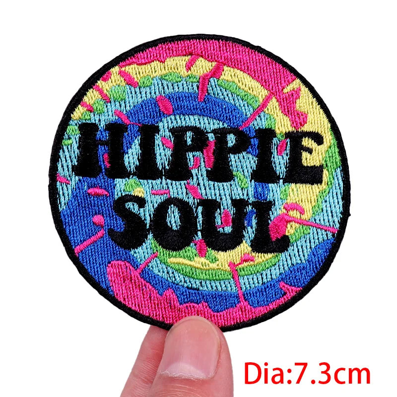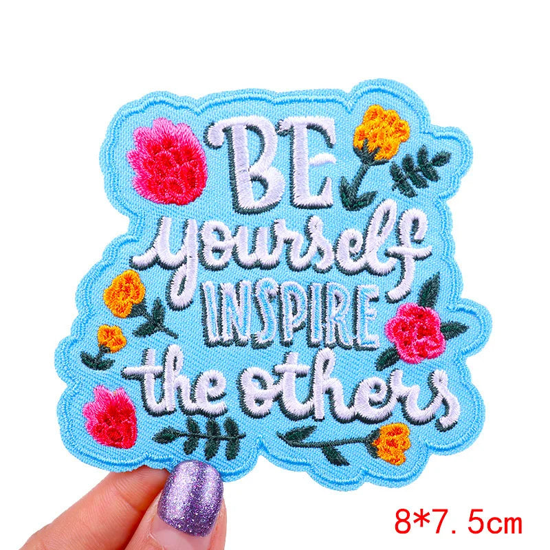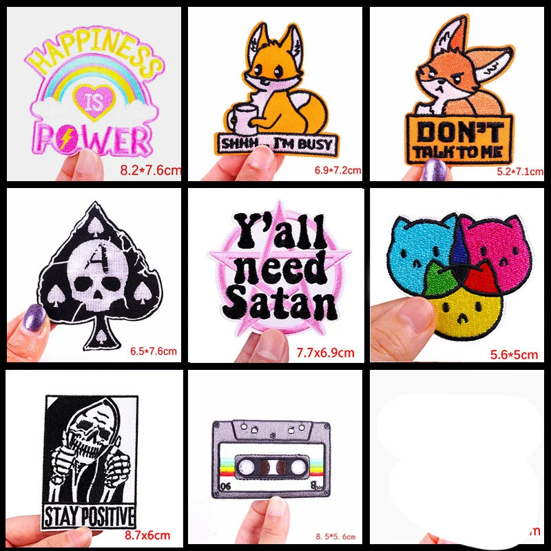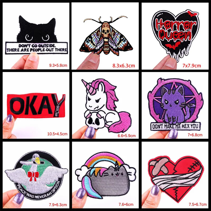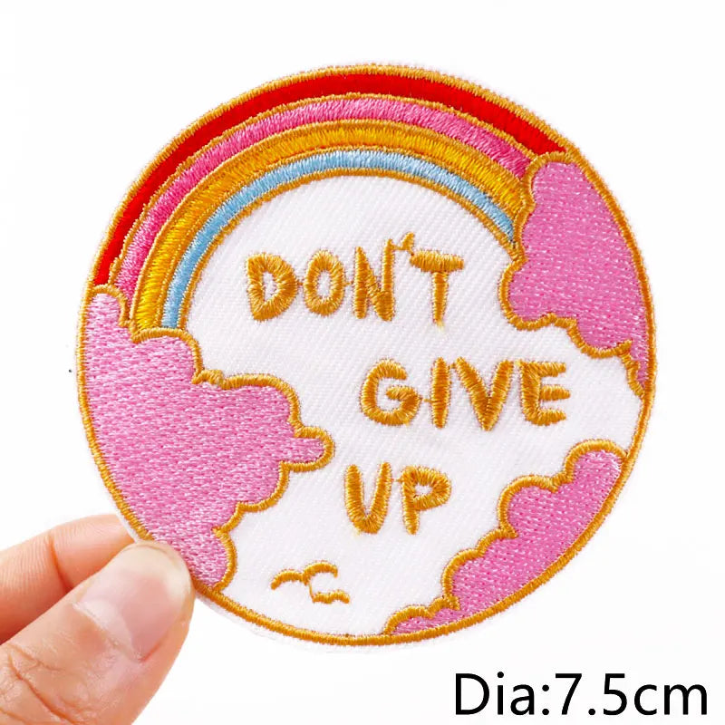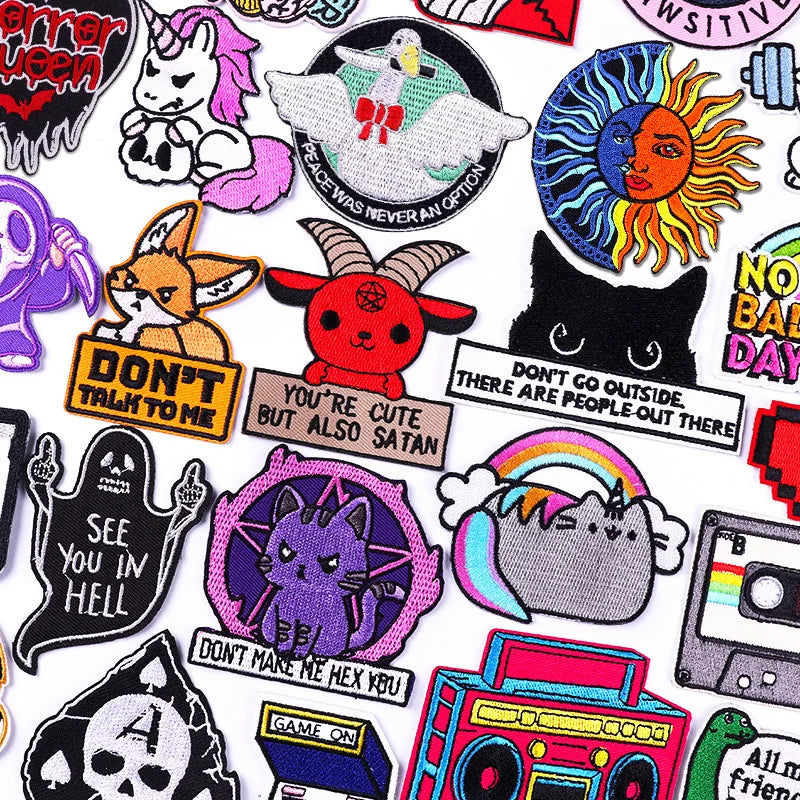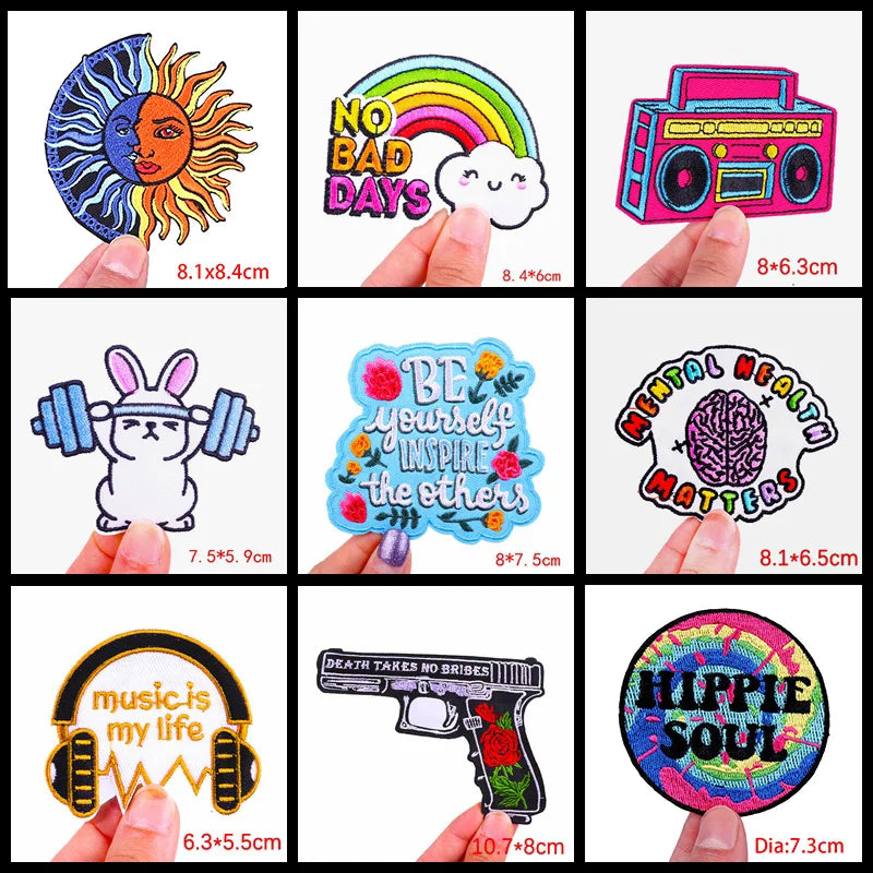 Colorful embroidered patches with cats, unicorns, rainbows, sun and moon, peace symbols, and uplifting quotes on a white background