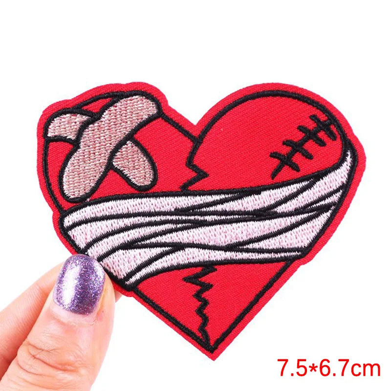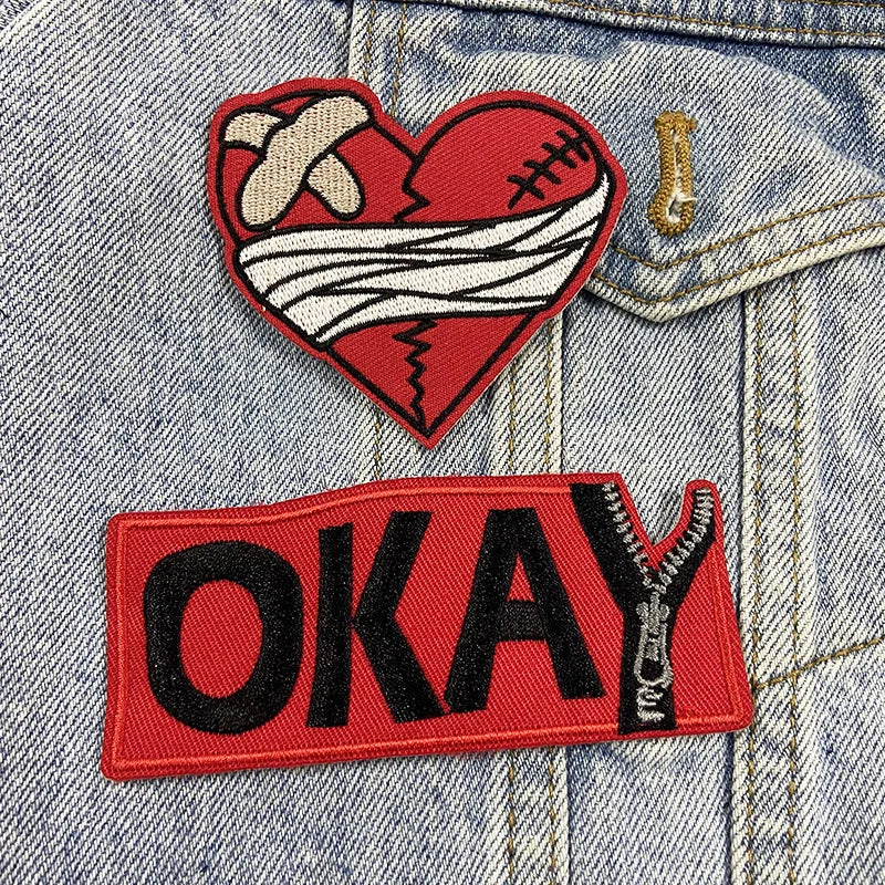 Two patches on a denim jacket: one heart-shaped with a bandage and the other &