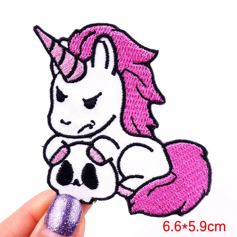 Embroidered patch of a unicorn with pink hair and a skull design, held by a hand with purple nail polish.