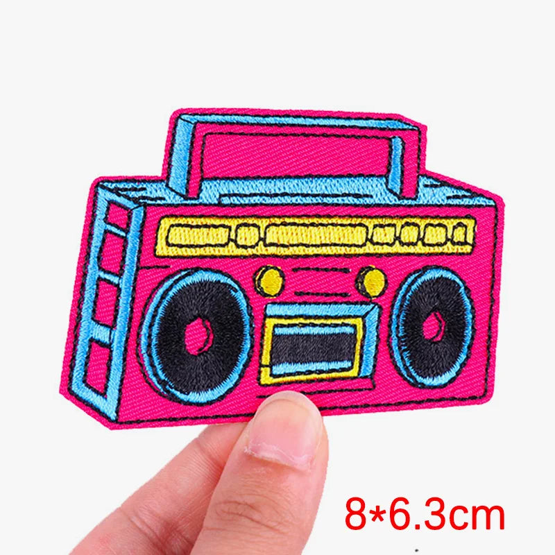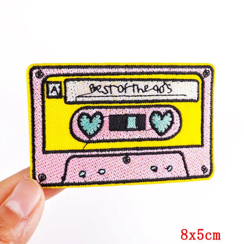 Embroidered patch of an arcade machine with a heart on the screen, held by a hand.