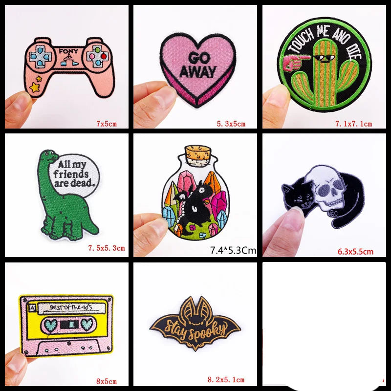 Collection of various embroidered patches held by fingers, with dimensions displayed below each.