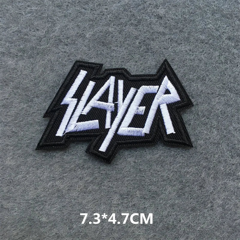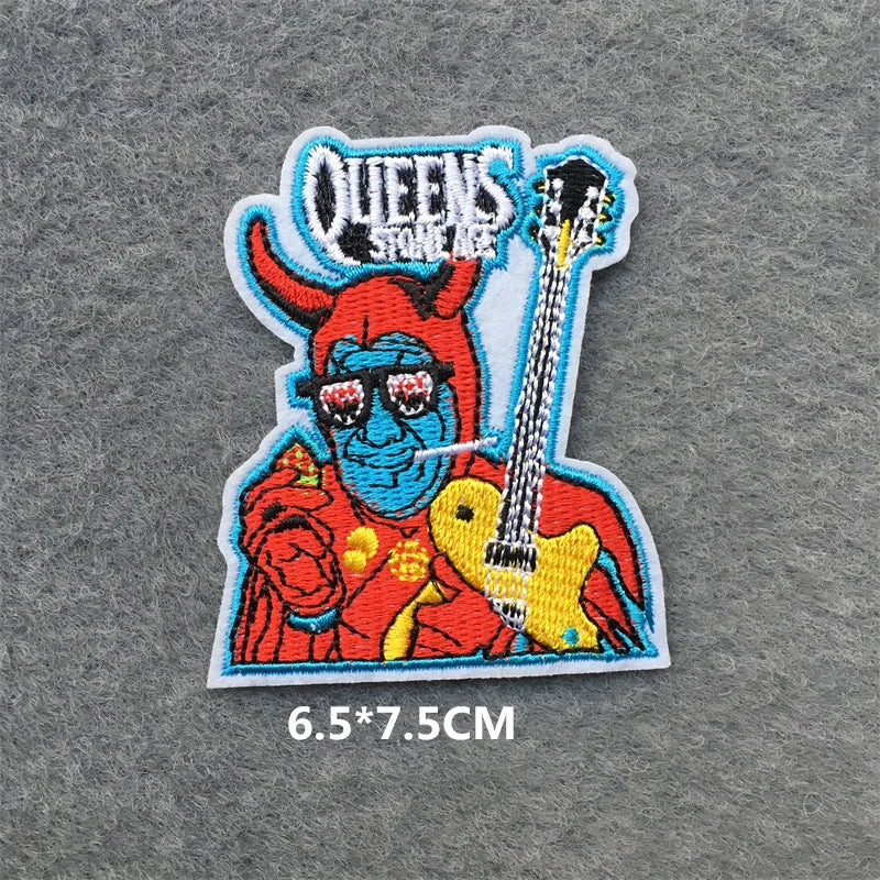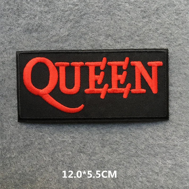 Iron-on embroidered band logo patches including Queen, Green Day, KISS, Slayer, Muse, and more on grey background
