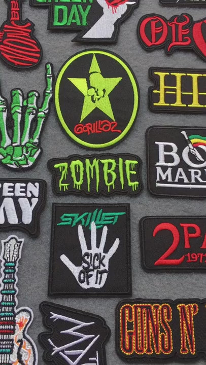 video of Iron-on embroidered band logo patches including Queen, Green Day, KISS, Slayer, Muse, and more on grey background