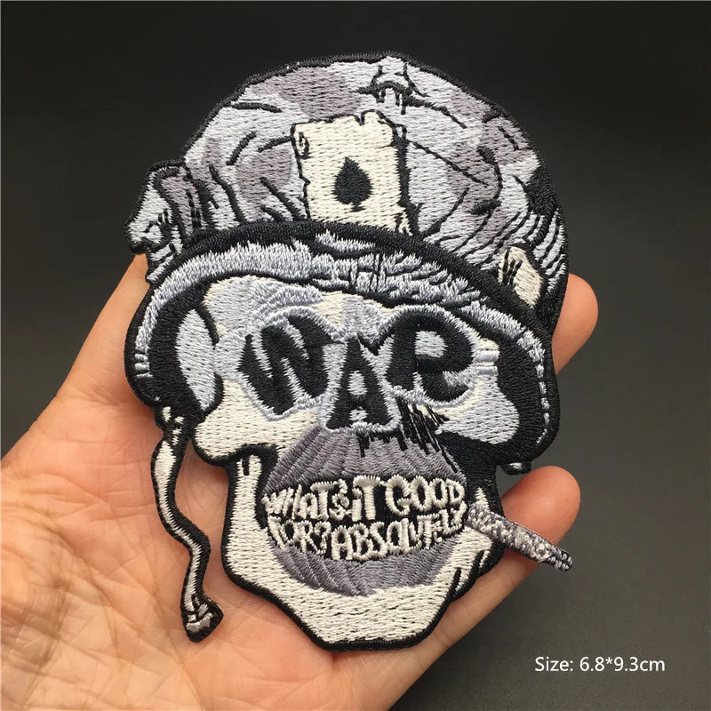 Embroidered patch with skull design and text held in a hand against a dark background