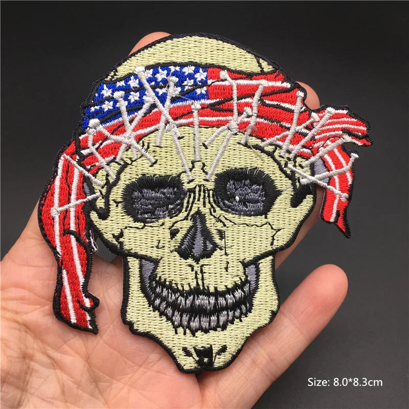Embroidered patch of a skull with American flag headband held in hand