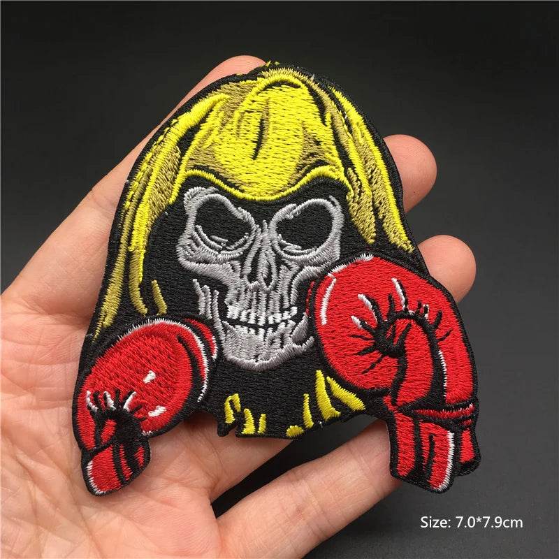 Skull with yellow hair and red boxing gloves patch held in a hand against a dark background