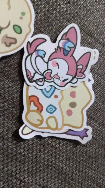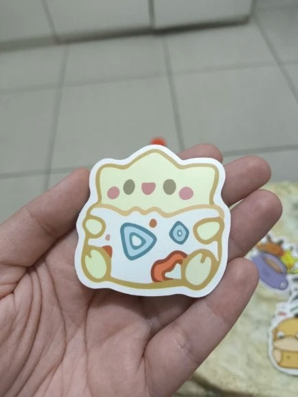 Cartoon character sticker held in front of a collection of colorful cartoon stickers.