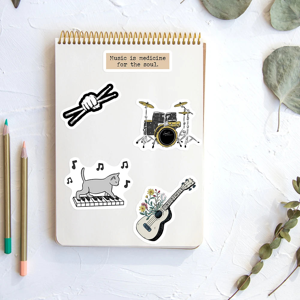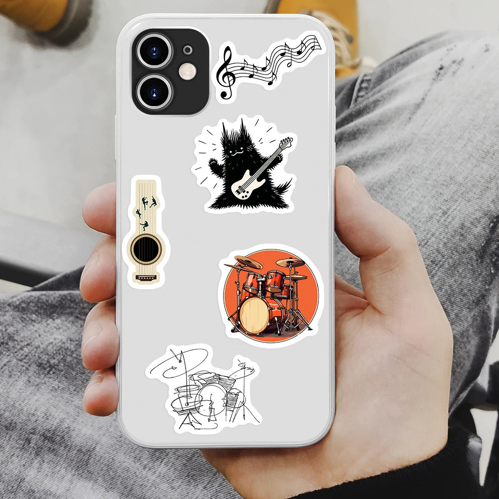 Turn your gear up to 11 with music-themed decals featuring guitars, basses, drums and rock & roll vibes. Durable PVC stickers for laptops, bottles, cases and more.
