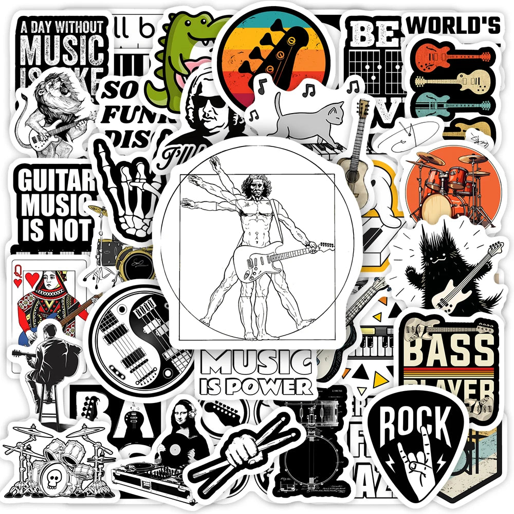 Collection of music-themed stickers featuring guitars, musicians, and related graphics.
