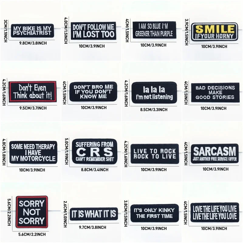 Unleash your attitude with a twenty-piece pack of funny, sarcastic and edgy quote patches. Crisp embroidery, bold lettering and easy iron-on application make it simple to customize jackets, jeans, backpacks, hats and more.