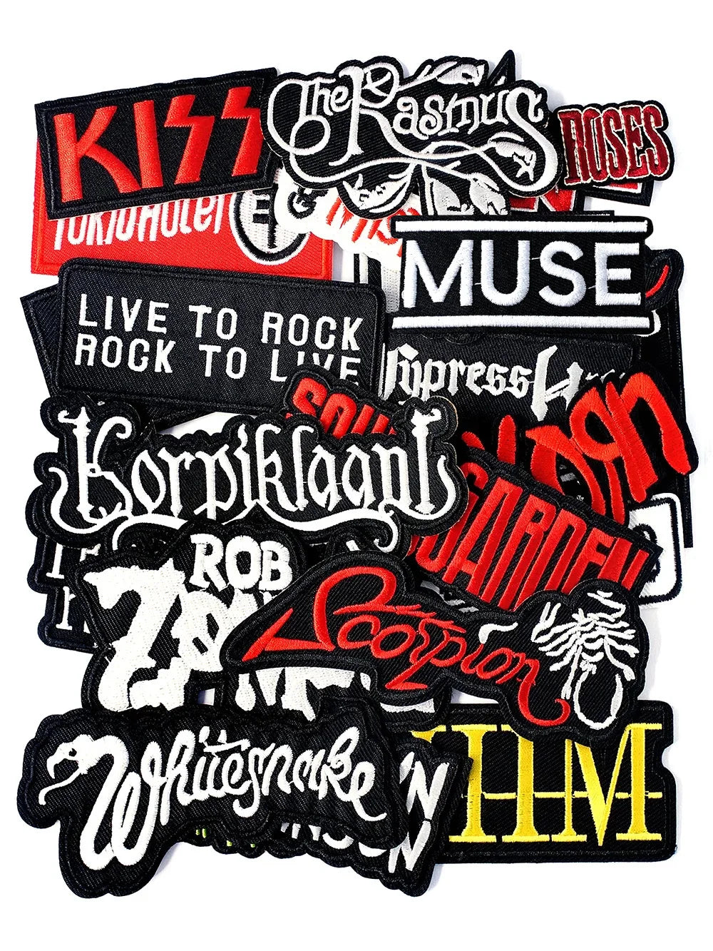 Music band patches including Kiss, Muse, and Marilyn Manson and others on a white background.